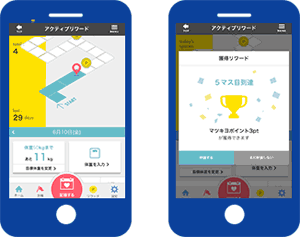 このアプリでは健康生活応援の意味で、毎日の運動を記録できる機能があり、運動の目標達成をすることでポイントを獲得できる仕組みとなっています。